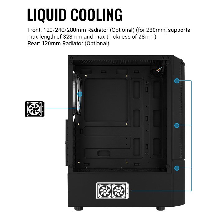 Admite la refrigeración líquida en la parte delantera y trasera de la caja